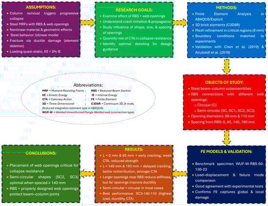 Figure 16 illustrates the workflow of this study. It highlights the assumptions, the FE modeling process, different RBS–web opening configurations, and the main findings on progressive collapse resistance.
