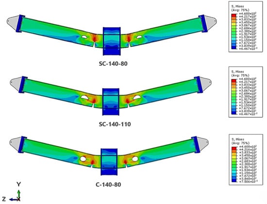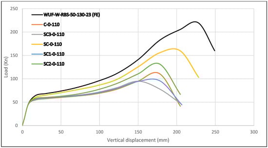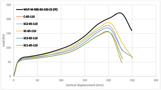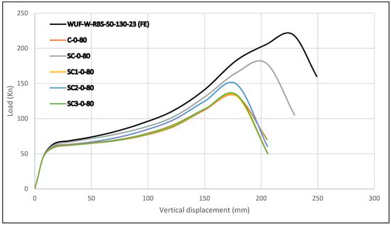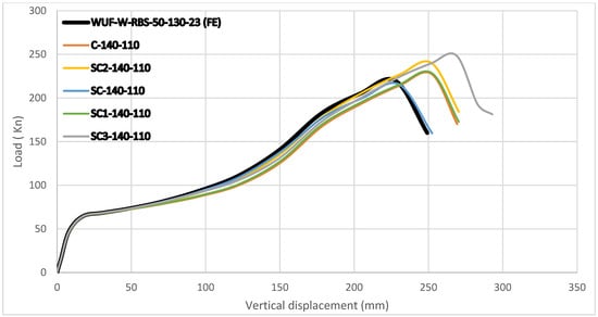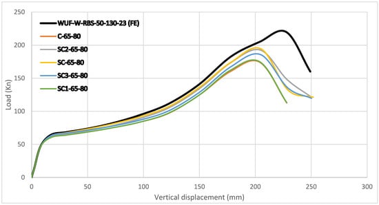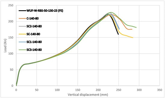 For specimens with 80 mm openings at L = 140 mm, the load–displacement curves looked almost the same as the control model WUF-W-RBS-50-130-23 (FE) (Figure 24). Only small stiffness losses appeared, while the ultimate loads were slightly higher.