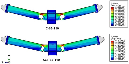 These results show that larger openings at larger spacing improve ductility and ultimate strength. This agrees with Altheeb et al. []. Semi-circular openings, in particular, when placed carefully, perform better than circular ones. At small spacing (L = 0 mm and L = 65 mm), semi-circular shapes worked better than circular but still reduced stiffness compared with the control. Increasing spacing to 140 mm greatly improved performance, with SC3 and SC2 giving the best results in terms of load and delayed cracking. These findings provide an additional contribution to the provisions of FEMA-350 [], which does not explicitly address the combined influence of reduced beam sections and web openings on progressive collapse resistance