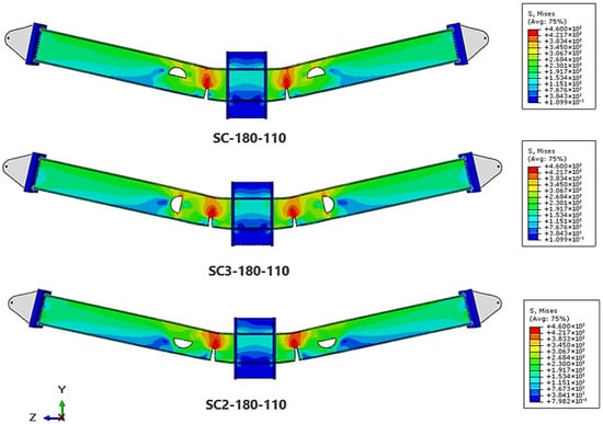 Openings of 80 mm and 110 mm diameter were introduced in both circular and semi-circular shapes (Figure 14). Their positions were varied relative to the RBS centroid at distances of 0 mm, 65 mm, 140 mm, and 180 mm. Semi-circular openings were placed in four layouts (SC, SC1, SC2, SC3) as shown in Figure 15.