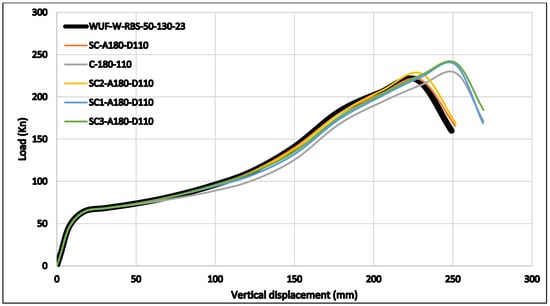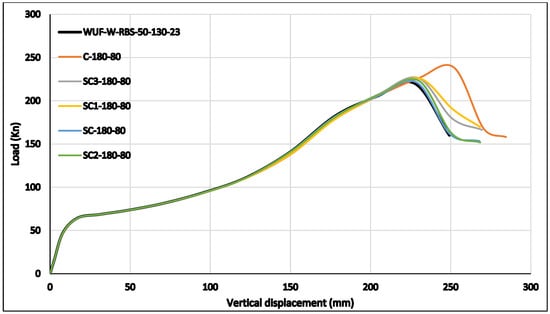 Referring to the load–vertical displacement curves, only small differences in stiffness were found among the specimens with 80 mm openings at L = 180 mm (Figure 25). All of them behaved very similarly to the reference specimen in terms of initial stiffness and overall load–displacement response. Most reached their peak load at around 230 mm mid-span displacement. The exception was C-180-80, which reached a higher peak load at nearly 250 mm displacement. This confirms that larger spacing between RBS and RW gives the structure more deformation capacity before cracks start.