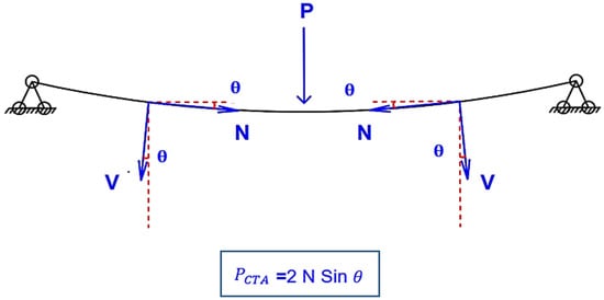 Many studies [,,,,] have highlighted the important role of catenary action (CTA) in resisting progressive collapse. CTA acts as a key internal mechanism that comes into play when beams undergo large deformations. Once the flexural resistance of a beam is used up, CTA provides an extra safeguard against complete failure.