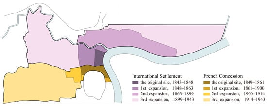 In 1842, Shanghai was forced to become a treaty port pursuant to the Treaty of Nanjing. Subsequently, the British Settlement was established in 1845, followed by the American Settlement in 1848 and the French Concession in 1849. After several expansions, the boundaries of the Shanghai International Settlement (formed by the merger of the British and American Settlements) and the French Concession were largely finalized by the 1890s to 1910s [,] (Figure 1).
