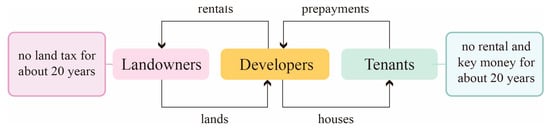 Amidst this demand-driven market boom, small-scale real estate companies pioneered the PBHRLM. This model operated on a prepaid consumption principle: consumers advanced payments to service providers, receiving redeemable entitlements for future commodities or services, while providers deducted operational costs from prepooled funds []. When adopting this model, developers must first secure a land lease agreement with landowners. Upon obtaining the land, developers refrain from immediate construction. Instead, they published advertisements in newspapers detailing the project location, building specifications, construction time nodes, and lease duration, while stipulating that tenants must pay prepayments to initiate construction. Once the accumulated prepayments covered the costs for multiple residential units, developers commenced building. Upon completion, tenants occupied the premises. Most leases ran for approximately 20 years, during which tenants paid neither rent nor key money. This arrangement effectively constituted a surface rights purchase for the lease term, generating substantial rental cost savings for tenants (Figure 2).