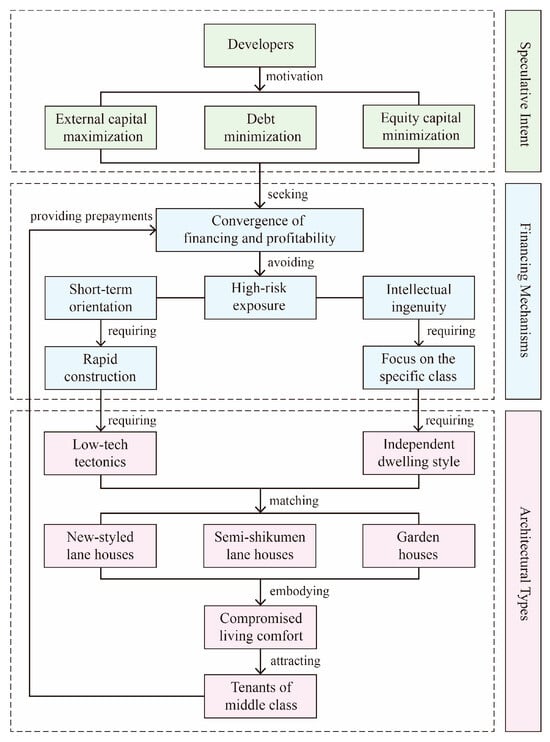 Herein, the tripartite relationship among financing mechanisms, architectural types, and speculative intent constitutes the key to analyzing the spatial generative mechanisms of the PBHRLM. Consequently, this conceptual model is further elaborated on in Figure 4.