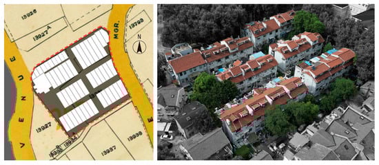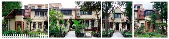 The garden houses constitute the second most prevalent architecture type among the cases, which emerged in Shanghai during the 1870s. Initially, they were high-end residences self-built and self-occupied by a small number of the wealthiest elites. Typically, they comprised a detached house for the owner’s residence, enclosed by an open garden. Beginning in the 1910s, large-scale companies commenced the standardized construction of garden houses for rental or sale. Compared to the self-built, owner-occupied garden houses, these developer-built houses were arranged in a scattered or clustered layout. Though the volume of each residential unit was reduced, it maintained the status as an independent residence for a single household. For instance, the property Jufu Xincun adopted this architectural type (Figure 7). From 1938 to 1939, the real estate developer constructed the property in three batches, collecting prepayments from tenants prior to the commencement of each phase [,,,].