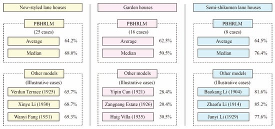 Second, the “high-density” feature is also reflected in the data. This research compares the building density of three types developed under the PBHRLM with similar types developed using conventional models. The results show that the average and median density for all types exceed 50% (Figure 9). Among them, the density of new-styled lane houses developed under PBHRLM remains similar to those built with conventional models, with both average and median values exceeding 64%. The average density of garden houses developed under PBHRLM reaches 62.5%, with a median of 50%, significantly exceeding those developed by conventional models. Meanwhile, the density of semi-shikumen lane houses developed under PBHRLM is slightly lower than that of traditional shikumen lane houses, though the absolute values remain high—with an average of 64.5% and a median of 76.4%.