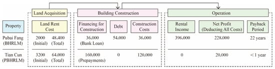 Firstly, employing the BHRLM significantly reduced land development costs. In early modern Shanghai, buildings were generally low-rise and constructed with relatively inexpensive materials. Consequently, the land value frequently exceeded the construction cost of an ordinary architecture occupying the same plot area []. This means that an effectively managed BHRLM could yield huge returns relative to the initial low-capital outlay.