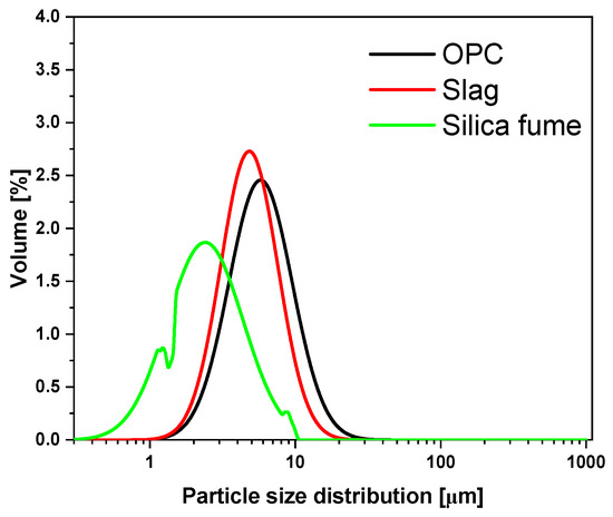 Particle size distribution of cement, slag and silica fume used in this study.