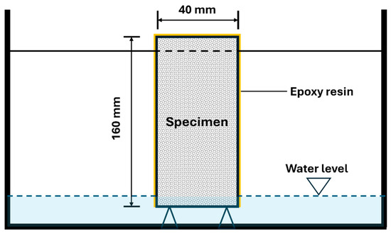 The one-sided rate of water absorption was measured following ASTM C1585-20 (one-face exposure) [32], with sealing and immersion head as described below. Duplicate specimens (40 mm × 40 mm × 160 mm) of mortar were used to determine the water absorption values of mortar at 7 and 28 days. The specimens were oven-dried at 105 °C in the fan-assisted chamber to a constant weight, and the initial weights of all the tested specimens were noted simultaneously; then the specimen surfaces were coated with epoxy resin, except one exposed surface. The cured specimens were immersed in water at 20 ± 2 °C and kept 2.5 cm water head. The schematic graph of the water absorption test is shown in Figure 2.