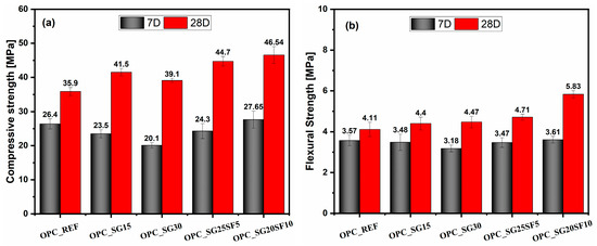 Figure 3 illustrates the mechanical properties of mortars incorporating various supplementary cementitious materials at 7 and 28 days. As shown in Figure 3a, all modified mixtures except OPC_SG30 (which shows comparable strength) exhibit higher 28-day compressive strength compared to the reference (OPC_REF). Notably, the OPC_SG20SF10 mix achieves the highest compressive strength of 46.54 MPa at 28 days, indicating that the combined use of slag and silica fume can effectively enhance the long-term strength development of mortar.