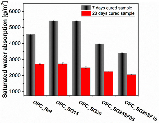 At 28 days, the trend becomes more evident-blended systems, particularly those with both slag and silica fume (OPC_SG25SF05 and OPC_SG20SF10), exhibit much lower water absorption than the reference (reference: 2721.57 g/m2; OPC_SG25SF05: 2249.96 g/m2; OPC_SG20SF10: 2056.06 g/m2). The lowest value is observed in OPC_SG20SF10, highlighting the synergistic effect of slag and silica fume in enhancing matrix compactness and reducing capillary porosity. This result is consistent with the strength improvements seen in Figure 3.