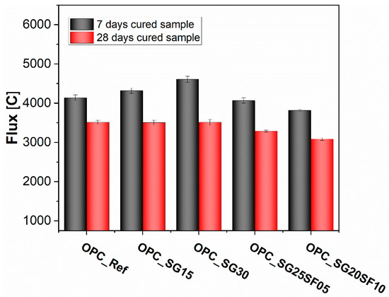 Among all mixtures, OPC_SG20SF10 showed the lowest charge passed at both 7 and 28 days, 3815 C and 3084 C, respectively, suggesting the most effective chloride resistance. This improvement is attributed to the synergistic effect of slag and silica fume in refining pore structure and enhancing matrix densification. The addition of silica fume, particularly in OPC_SG25SF05 and OPC_SG20SF10, led to a greater reduction in flux compared to mixtures with slag alone (OPC_SG15 and OPC_SG30), indicating its more pronounced role in blocking ionic transport.