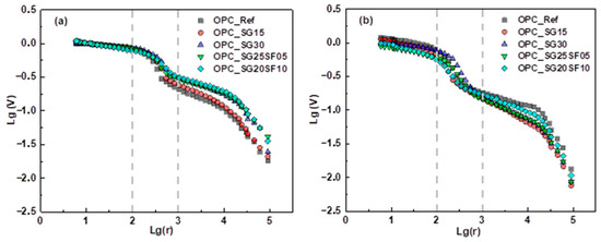 Higher fractal dimensions indicate a more complex and irregular pore network. Across both curing ages, all samples with supplementary materials exhibit higher Df values than the reference, suggesting enhanced pore complexity and refinement. Notably, the OPC_SG20SF10 sample shows the highest Df at both 7 days (2.4387) and 28 days (2.4663), implying a more developed and denser pore structure. The high R2 values (>0.92) confirm the reliability of the fractal model fitting.