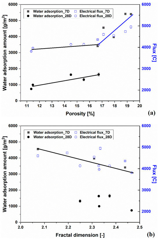 The relation of water absorption values and electrical flux to porosity (a) and fractal dimension of pores (b).