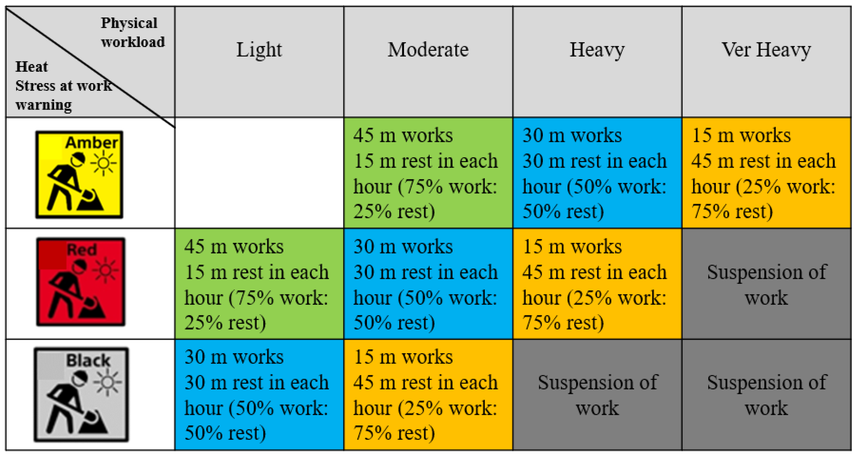 | Construction Industry Council Guidelines on Site Safety Measures for Working in Hot Weather (2013) issued by Construction Industry Council (CIC) [79] | These guidelines address the specific challenges of working in high temperatures, proposing site-specific solutions such as shaded rest areas, cooling breaks, and task scheduling. The recommendations are widely adopted in the construction sector. |