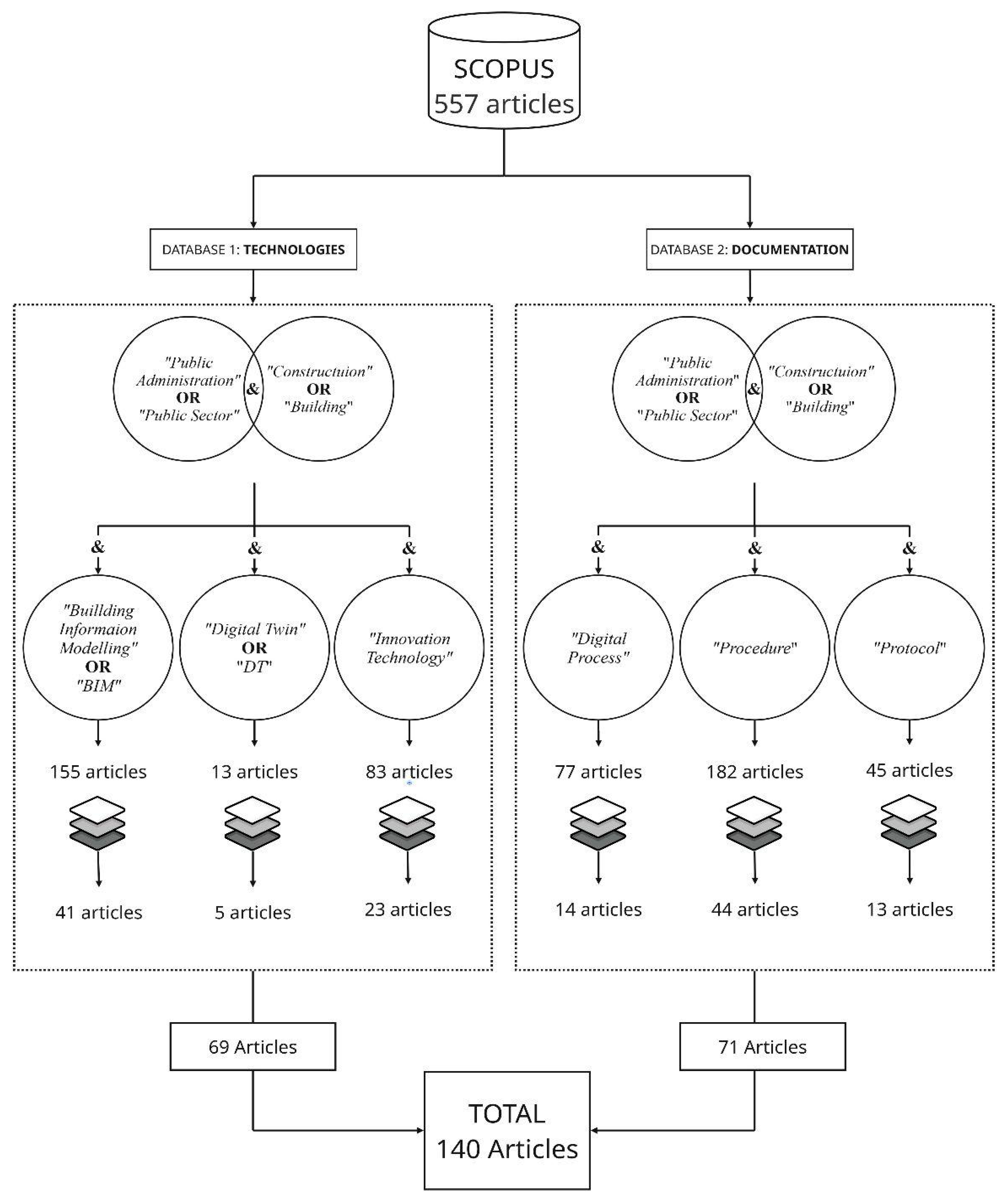 After applying the selection criteria outlined in the methodology, the total number of analysed articles was reduced to 140. Figure 1 (and Figure A2) provides a graphical representation of the article screening process, illustrating how the initial set of 150 articles was narrowed down to 140 for the subsequent analysis, and highlighting the two main thematic clusters identified. The final distribution of selected articles, corresponding to over 25% of the initial corpus, is as follows:- 69 articles concerning digitalisation technologies, examining the maturity level and diffusion of innovative tools within public construction.
