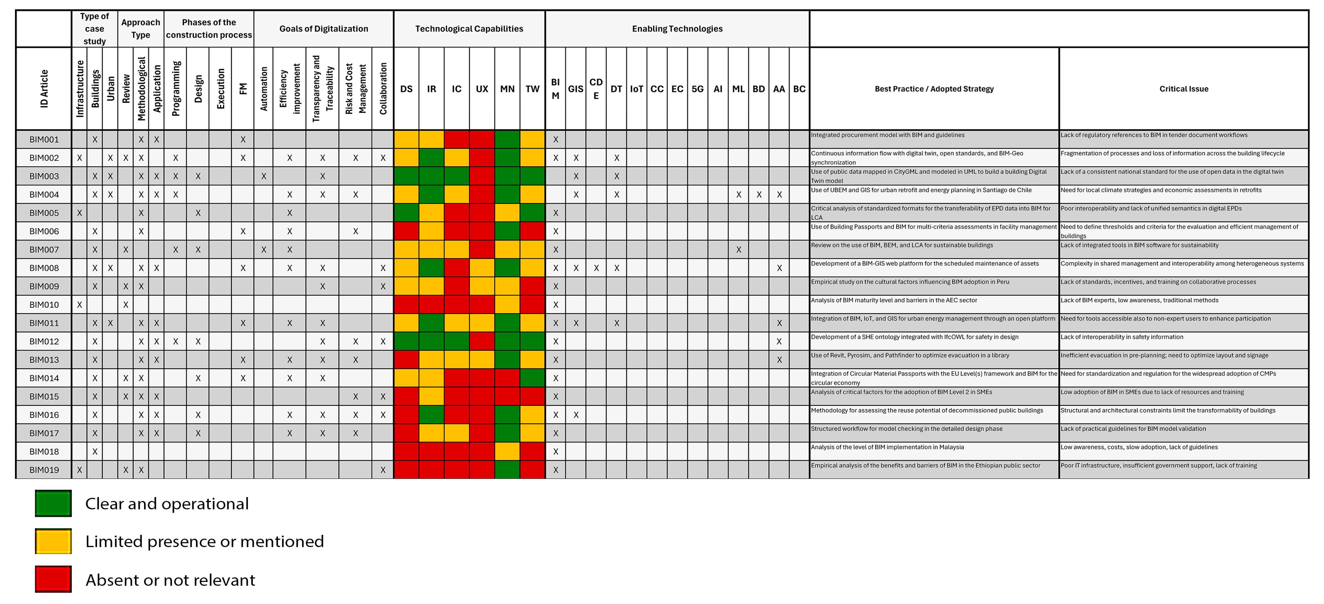 - Yellow—limited presence or mentioned: the technology is referenced in the text, but its use is marginal, unsystematic, or not supported by practical application.