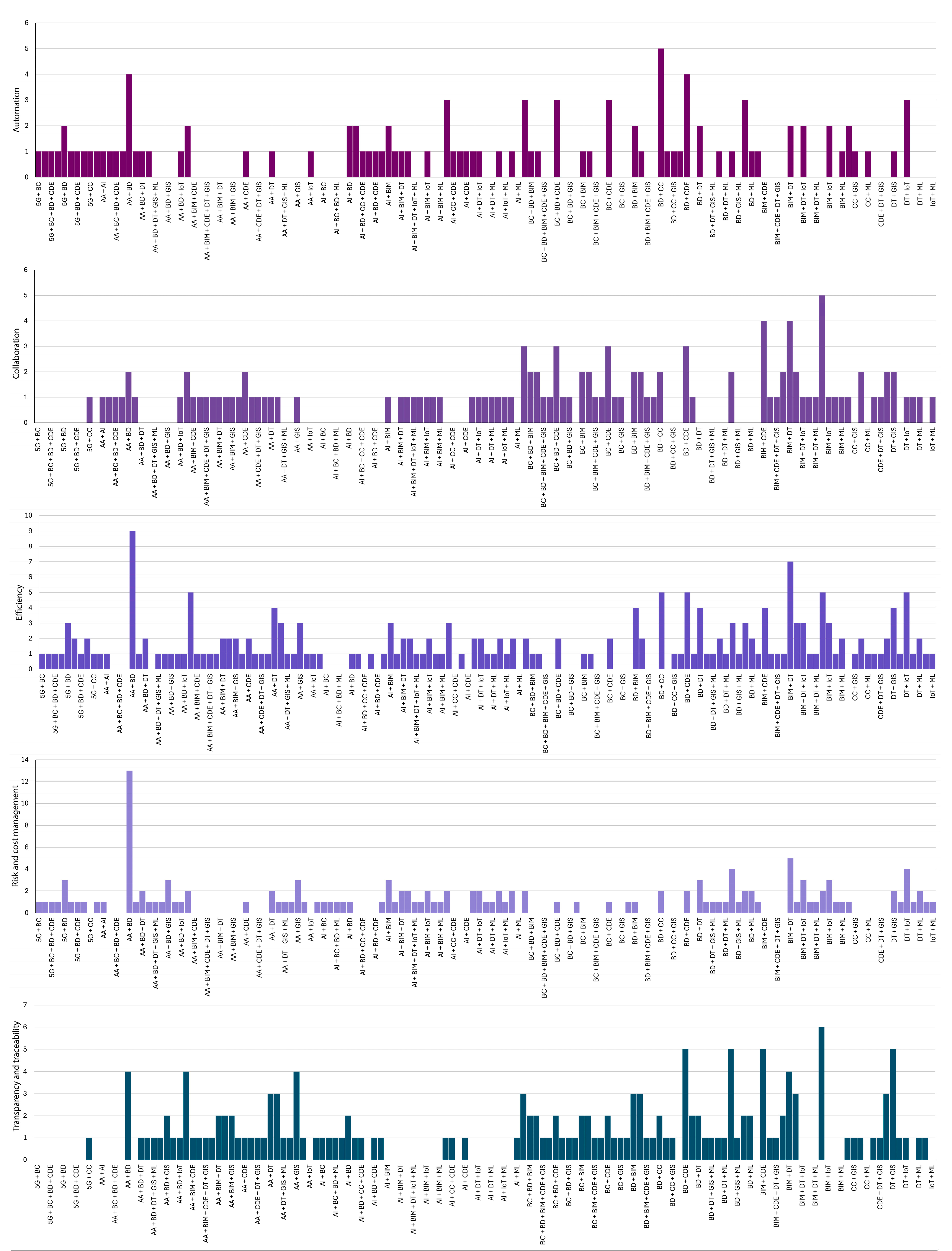 - Digitalisation Technologies (251 articles): This category includes studies analysing the implementation and use of digital technologies within the public sector and construction industry. The main topics addressed include: