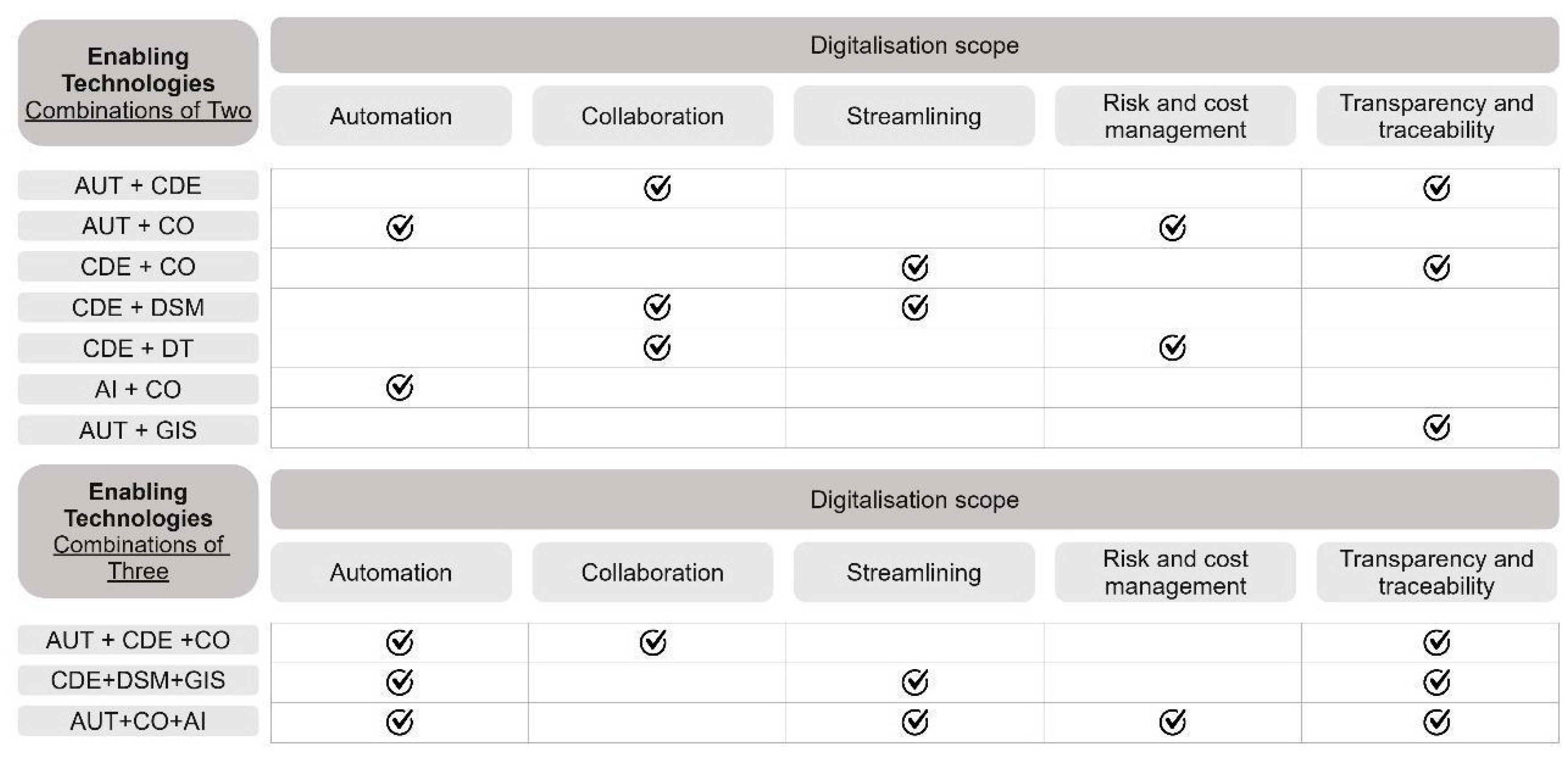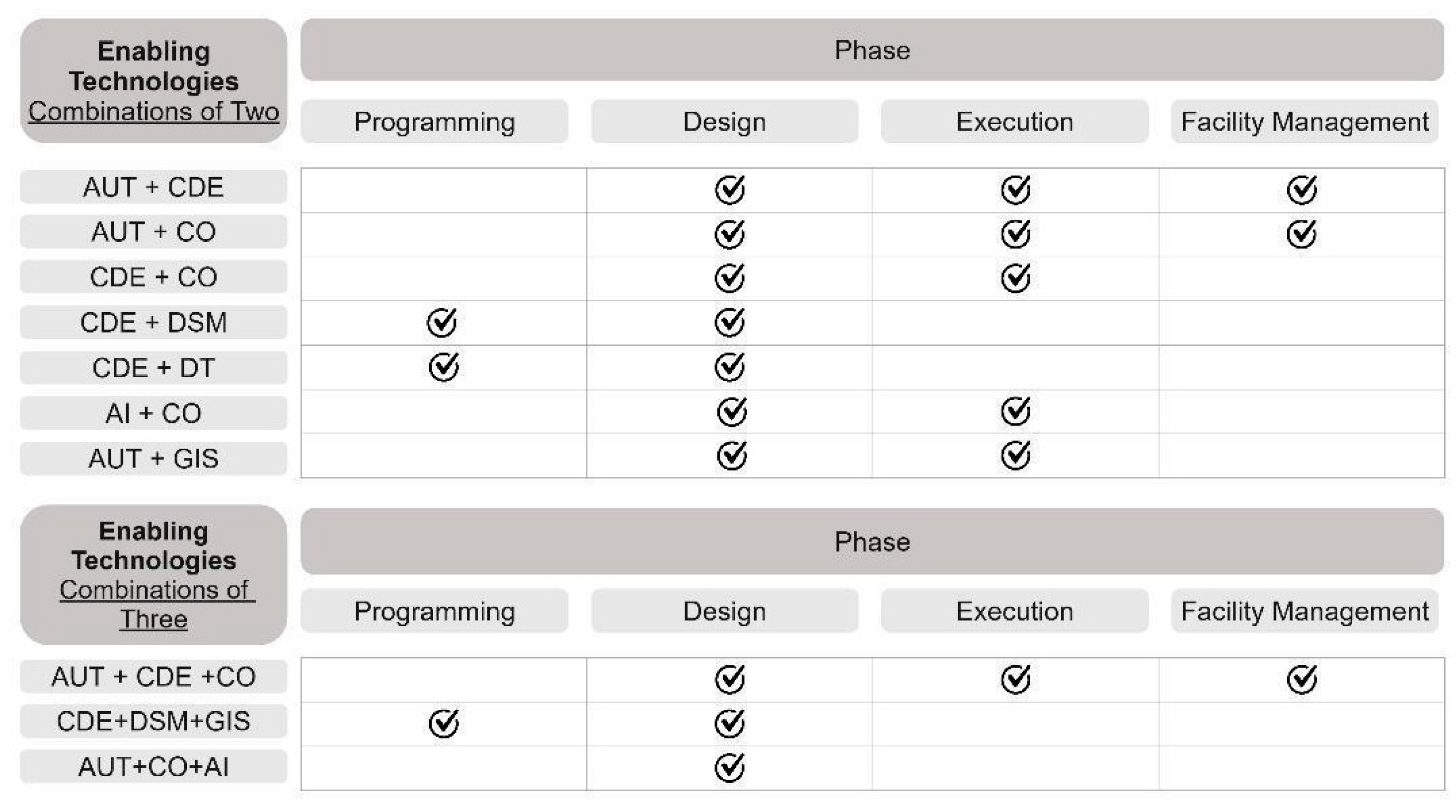Building Information Modelling (BIM) | Revit, BIMReL, BIM + GIS integration, BIM + IoT, blockchain-enabled models, BIM plug-ins, model checking, 3DStock, Last Planner System, Design for Manufacturing and Assembly (DfMA) |