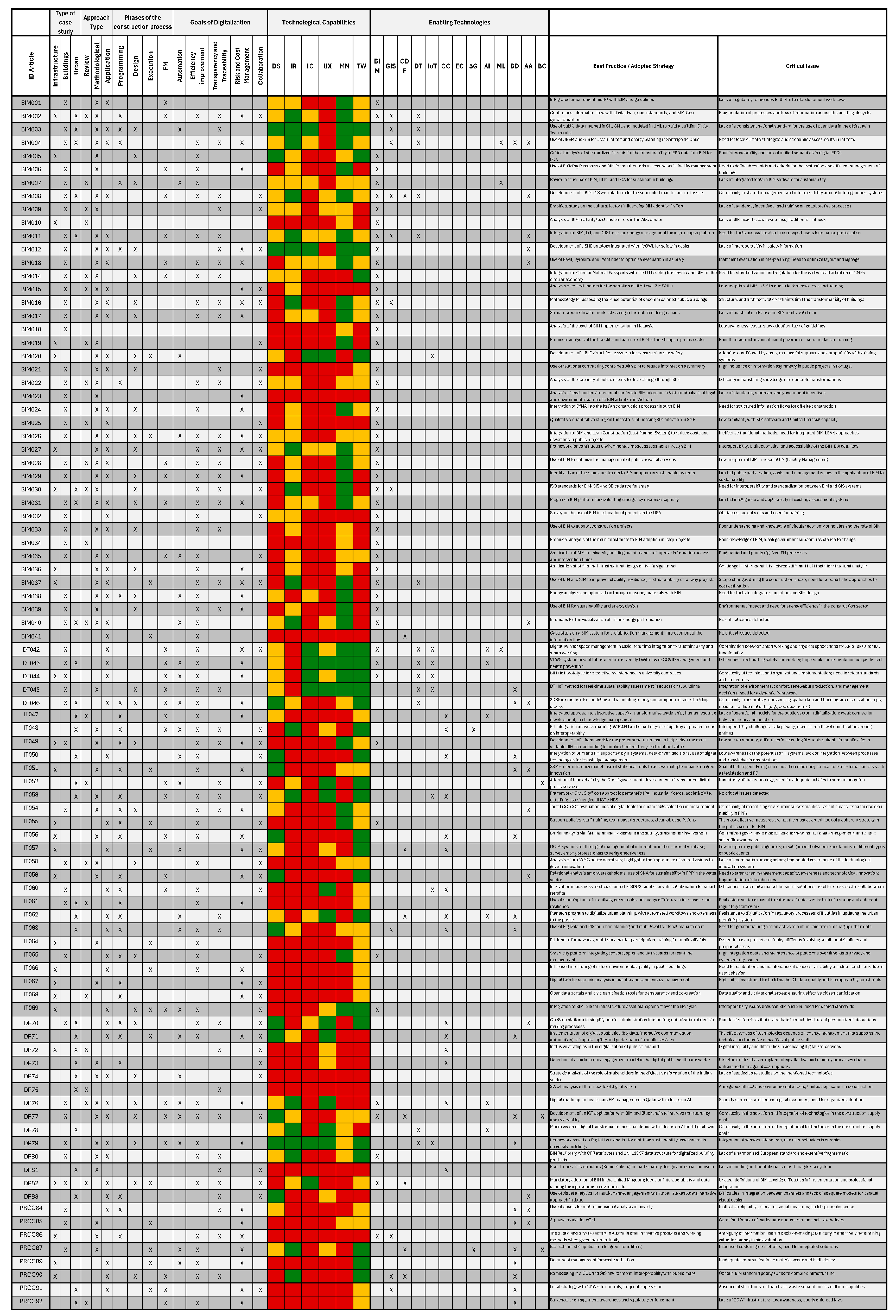 - Relevance to the Selected Literature: only articles directly addressing the topic of digitalisation in PA and the construction sector were included, excluding studies with a marginal focus or not closely related to the subject.