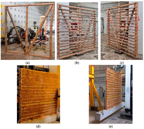 Tested bahareque walls: (a) guadua skeleton (GS); (b) guadua skeleton with horizontal guadua strips (GSH); (c) timber skeleton with horizontal guadua strips (THS); (d) guadua skeleton with horizontal guadua strips and soil mixture infill (GSHS); (e) timber skeleton with horizontal guadua strips and soil mixture infill (TSHS).