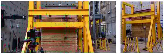 Figure 3 illustrates the pseudo-static test setup for bahareque walls. A servo-controlled MTS hydraulic actuator (MTS Systems, 14000 Technology Dr, Eden Prairie, MN, USA), mounted on a reaction wall, applied cyclic horizontal displacement at the top of specimens. A rolling mechanism, supported by a reaction steel frame, ensured in-plane motion. The actuator was connected to the bahareque walls through two steel plates linked by four rods, allowing reversible displacement. A steel beam placed on top simulated roof loads, applying a total vertical load of 1.9 kN. The foundation consisted of a concrete beam designed to replicate stone or cyclopean concrete foundations commonly found in the field. This foundation beam was anchored to the strong floor of the structure’s laboratory. For additional details on test procedures, material characterization, construction considerations, experimental results, and failure mechanisms, refer to [11]. Future research will focus on full-scale house models that incorporate out-of-plane behavior and the dynamic effects of earthquakes.