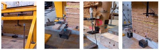 Instrumentation consisted of a total of seven LVDT sensors (OMEGA Engineering, Stamford, CT, USA) to measure horizontal and vertical displacements at strategic points on the walls, as shown in Figure 5. Three horizontal sensors were placed at the base, mid-height, and top of the central vertical axis of the wall to record lateral displacements, while four sensors were used to measure vertical uplift between the base element and the vertical side elements. The horizontal sensor at the base was installed to verify any relative movement between the wall and the foundation. During testing, it was necessary to remove some sensors once the allowable displacement was nearly reached. In addition, the hydraulic actuator was instrumented with a 250 mm-range LVDT sensor to verify that the displacement protocol was applied correctly, and it was also equipped with a load cell to measure the horizontal load applied to the wall specimens.