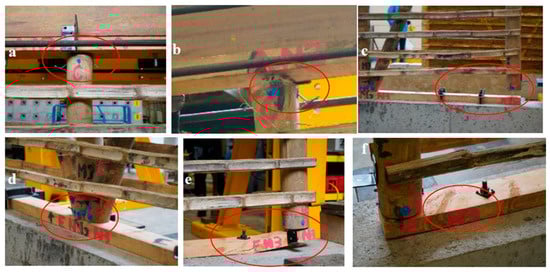 Type of damage in the timber skeleton with horizontal guadua strips (THS): (a–d) failure in the joint and (e,f) failure in the horizontal element.