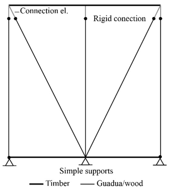 Finally, a model with non-linear elements and damage-controlled properties was implemented using the Puck failure model (BW-NS4), as introduced at the beginning of Section 3. This strategy was adopted because the models in Table 2 lacked a mechanism to capture the degradation observed experimentally at the connections. In this context, an analogy can be drawn with a composite material, where the matrix is represented by the wood and the fiber by the nail. Figure 7 illustrates the configuration of this model, which incorporates non-linear elements in the diagonal members, rigid connections at key joints, and simple supports at the base. Different line styles were used to distinguish between wood and guadua/wood elements. This modeling approach was ultimately selected because of its improved ability to replicate the structural response of bahareque walls under seismic loading. It is also worth noting that this model accounts for the potential occurrence of uplift at the base of the walls.