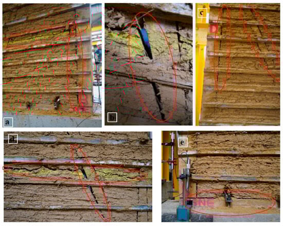 Types of damage in the TSHS wood frame with soil infill: (a,d) separation between soil infill layers; (b) separation between the diagonal and soil infill; (c) separation between soil infill and the vertical element; (e) separation between soil infill and the horizontal element.