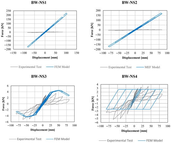 After developing the numerical model for the condition without infill (BW-NS5), the effect of the soil infill was analyzed. For these tests, longer loading protocols were applied than those initially presented in Figure 4. As a result, the experimental data include more hysteretic cycles than the FEM simulations, in which all models were subjected to the same protocol. The bahareque wall with soil infill model BW-S1 produced inconsistent results, showing a constant force of approximately 4.0 × 10−6 kN; therefore, its results are not presented.