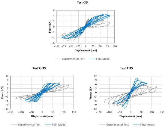 Finally, the BW-NS5 model, based on Puck’s failure criterion, provided a better fit with the experimental results, as its hysteretic cycles captured the degrading behavior up to medium drift levels, as shown in Figure 10. The model was able to partially reproduce the damping observed during testing, but it remains necessary to incorporate degrading properties in the other frame connections to accurately simulate behavior at higher drift values. A similar trend was observed across all tests, with good agreement in the initial stiffness of the GSH and TSH specimens, where horizontal strips were used. The presence of these strips increased the maximum wall strength, a response also predicted by the numerical model. The FEM model for the TSH test with wood elements resisted higher forces than the model with guadua elements. However, for these tests, the nonlinear behavior of the elements was not explicitly modeled, preventing the reproduction of greater degradation in the hysteretic cycles. Moreover, the level of nonlinearity hindered numerical convergence in some cases. These findings indicate that the proposed numerical model still has limitations in reproducing behavior at high drift levels, underscoring the need for further refinement.
