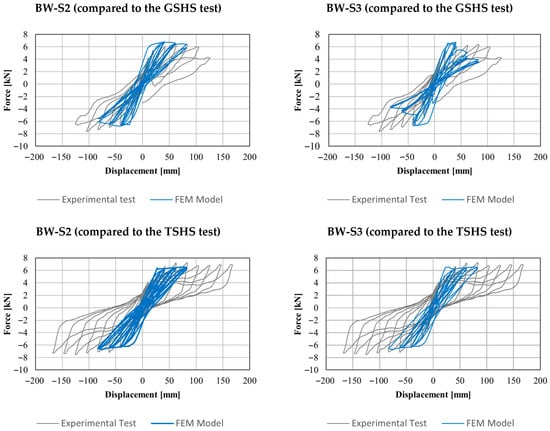 Comparison of the hysteresis cycles of the BW-S1 & 2 FEM model and the tests with soil infill.