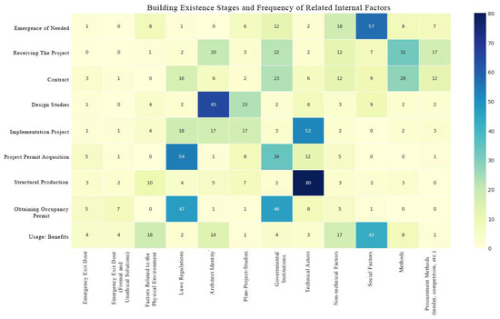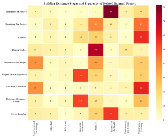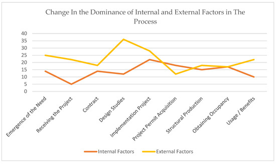 Participant responses indicated varying degrees of dominance between internal and external factors at different stages of the building-production process. Data reveal that external factors such as legislation, economic pressures, and bureaucratic procedures predominantly shape the production trajectory (Table 1). Conversely, internal factors, including architectural intention, design identity, and creative decisions, are frequently relegated to a secondary role, particularly during the implementation and permission stages. This pattern is also evident in the graphical analysis presented in Figure 3, which visualizes the participants’ perceptions of the relative influence of internal and external factors at each production phase. Whereas external influences are perceived to dominate the early design phases, the impact of internal dynamics increases significantly in the later stages, following the completion of regulatory and permit-related procedures (Table 1).