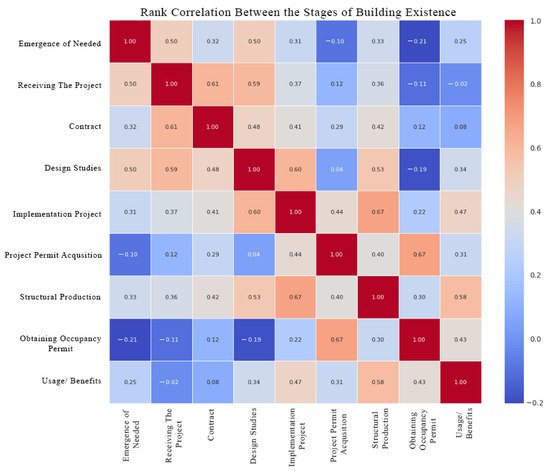 Sequential relationships between building production stages were further evaluated using Spearman’s correlation analysis (Figure 4), numerically representing interactions predicted by the “Building Anatomy” model. Spearman’s correlation is a non-parametric statistical method assessing the strength and direction of the association between two ranked variables (ρ from −1 to +1), suitable for ordinal data or monotonic relationships. This analysis helps reveal which stages are functionally linked and which remain disconnected, mapping the production organism’s inner coherence or fragmentation [62]. Correlation analyses demonstrate that the process is not linear; instead, it exhibits a multi-dimensional and fragmented structure, with strong relationships between some stages and disconnections elsewhere (Figure 4).