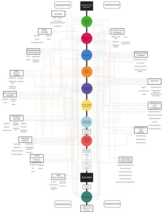 The body’s interoceptive system detects internal physiological and emotional states and generates corresponding responses [26]. In contrast, exteroception involves perceiving environmental changes and formulating appropriate perceptual inferences and reactions [32]. Harmony between these systems ensures the well-being of an organism. In architectural terms, maintaining a balance between internal mechanisms (e.g., architect identity, design ethics, and team structure) and external constraints (e.g., legal frameworks, economic pressures, and social expectations) is essential for sustaining a functional production process. Disruption of this balance results in what can be termed “metabolic deterioration” within the production system [33].