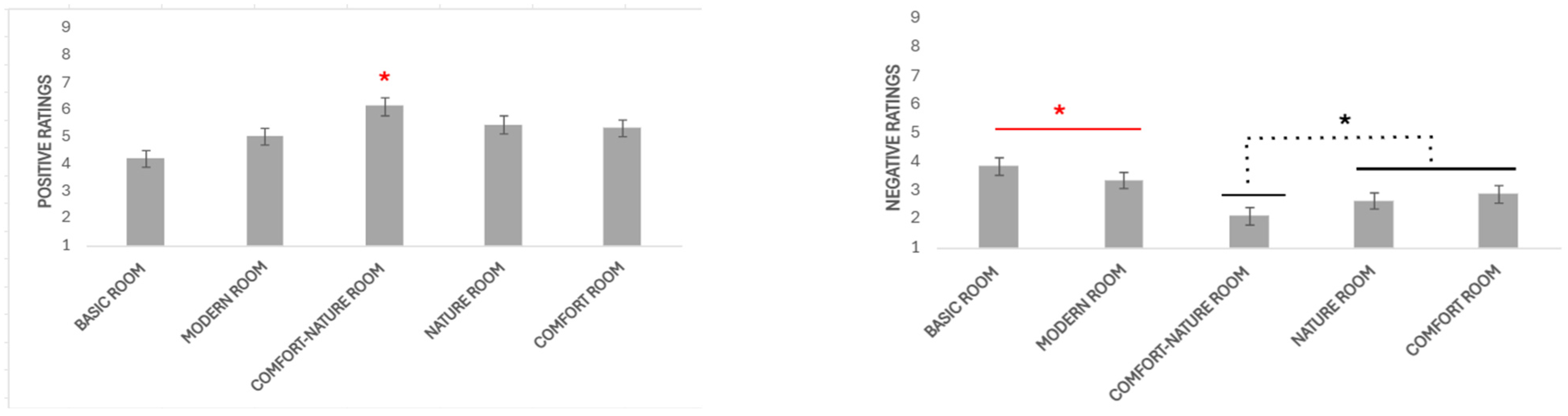 - Two separate one-way ANOVAs on the mean of the three positive adjectives (calm, energetic, happy; positive dimension) and on the mean of the three negative adjectives (nervous, weak, sad; negative dimension) with Rooms (five levels: Basic, Modern, Comfort, Nature, Comfort-nature) as a factor.