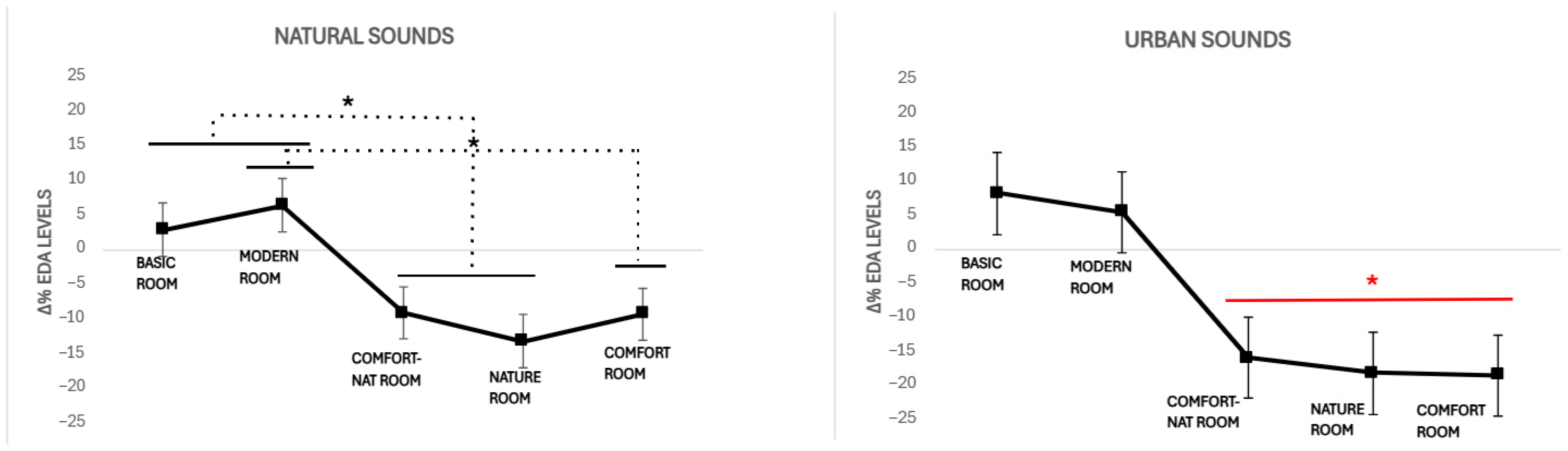 - A one-way ANOVA on the percentage variation of EDA levels from its baseline (Δ%) with Rooms (five levels: Basic, Modern, Comfort, Nature, Comfort-nature) as a factor. Then, to further explore the effect of sounds on participants’ subjective evaluations and EDA levels, we planned the following analyses distinguishing the rooms accompanied by natural sounds from those accompanied by urban sounds.