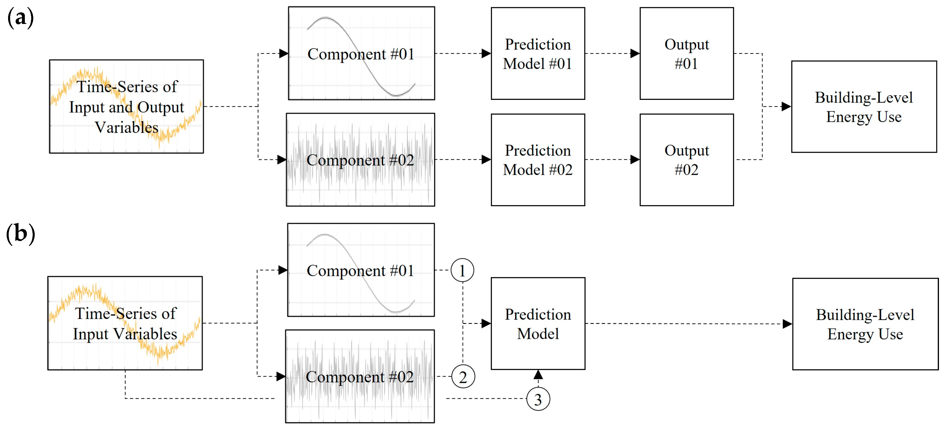 - Chou, S.Y.; Dewabharata, A.; Zulvia, F.E.; Fadil, M. Forecasting Building Energy Consumption Using Ensemble Empirical Mode Decomposition, Wavelet Transformation, and Long Short-Term Memory Algorithms. Energies 2022, 15, 1035. [Google Scholar] [CrossRef]