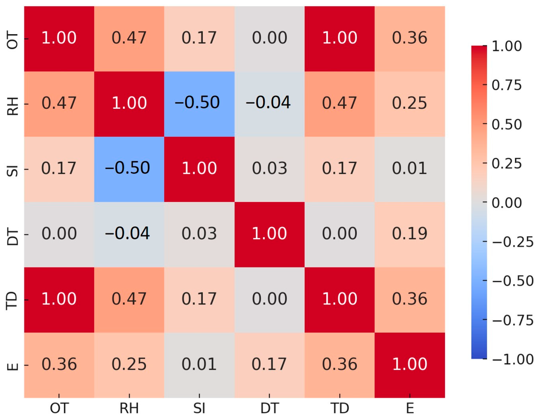 - Average daily outdoor temperature (OT): Mean ambient temperature recorded outside the case building over a 24 h period and had numerical values (e.g., 17 °C),