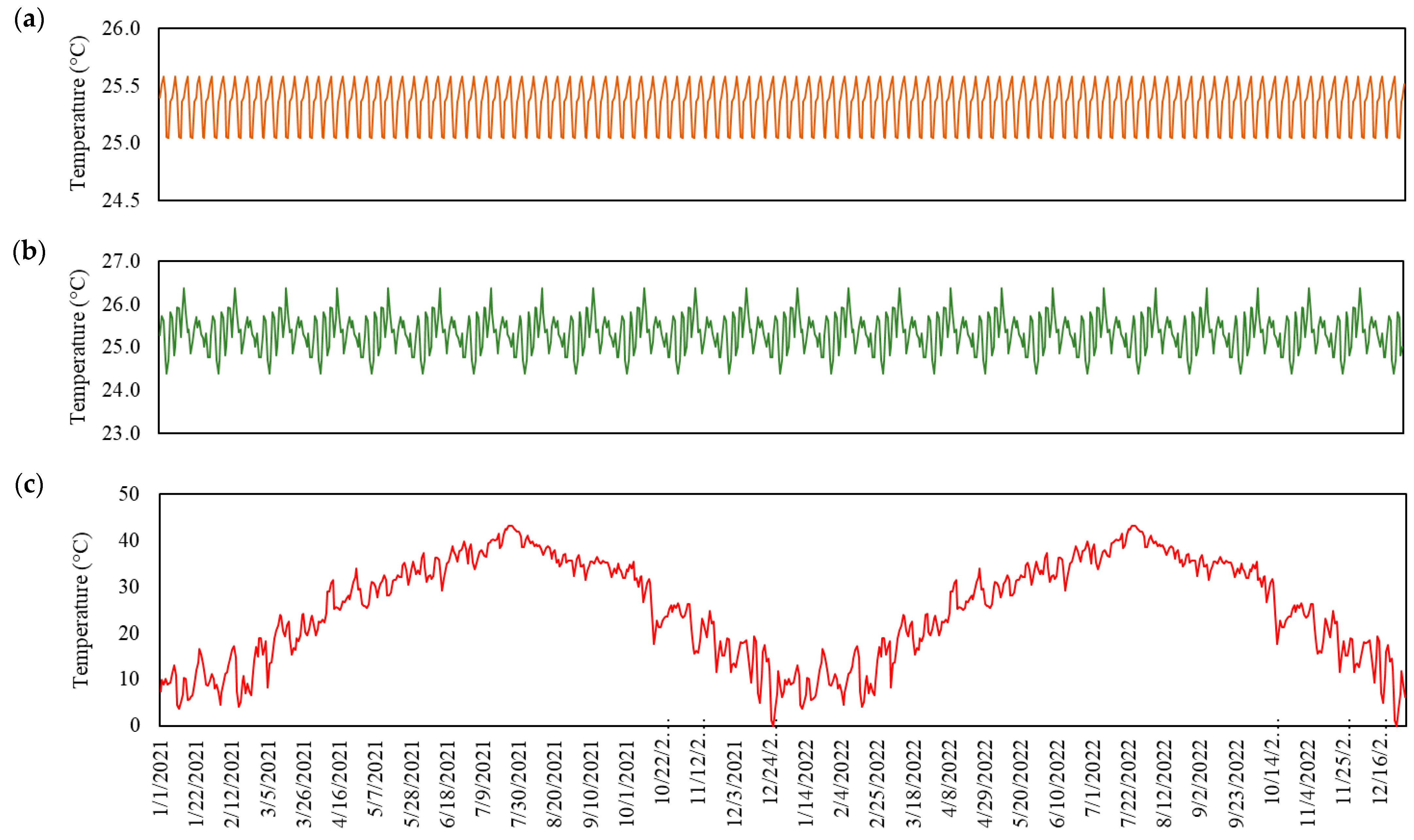 - American Society of Heating, Refrigerating, and Air-Conditioning Engineers (ASHRAE). ASHRAE Handbook Fundamentals; American Society of Heating, Refrigerating, and Air-Conditioning Engineers (ASHRAE): Atlanta, GA, USA, 2009. [Google Scholar]