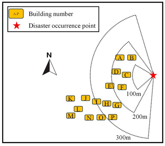 Following the occurrence of the geological hazard, settlement monitoring was promptly initiated to obtain a comprehensive understanding of the structural response of buildings within the affected area. Monitoring points were installed on 16 high-rise buildings located in the core zone. During the emergency response phase, settlement measurements were conducted daily to capture rapid deformation changes. As the situation stabilized, the monitoring frequency was reduced to once every 7 days. Once no significant additional settlement was observed, the frequency was further reduced to a 30-day interval. The spatial distribution of the monitored buildings is shown in Figure 1.
