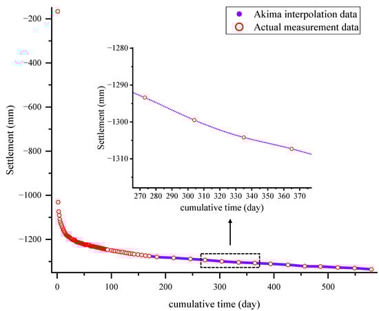 Due to variations in monitoring frequency during different stages of the hazard response, the raw settlement data exhibited pronounced non-uniform temporal intervals. The Akima interpolation method [] was adopted to preprocess the settlement monitoring data with non-uniform time intervals and missing records. Compared with conventional interpolation techniques such as linear interpolation, cubic spline interpolation, or polynomial fitting, Akima interpolation offers several advantages that are particularly suitable for building settlement data. Specifically, it (i) suppresses non-physical oscillations that frequently occur in cubic spline interpolation, (ii) provides smooth curves without overshooting, which preserves the physical rationality of settlement processes, (iii) exhibits robustness to local anomalies, ensuring that individual outliers do not excessively influence the overall curve, and (iv) performs well with irregularly spaced data, which is common in field monitoring. The Akima interpolation method was employed to transform the non-uniform time series into an evenly spaced dataset with a fixed interval of one day, as shown in Figure 2. As a result, a total of 580 interpolated data points were obtained for subsequent modeling and analysis.
