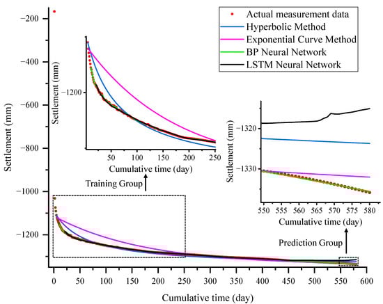 As illustrated in Figure 3, the overall trends of the predicted values and the measured values are consistent across all four models. However, significant differences can be observed in the training group. The exponential curve model exhibits poor performance in the early stage (0–250 days), with large deviations from the measured values; the hyperbolic model also shows a noticeable bias within the first 50 days. The LSTM neural network demonstrates excellent fitting performance on the training set, but its accuracy decreases sharply on the testing set, suggesting severe overfitting. In contrast, the BP neural network achieves good fitting performance on both the training and testing sets. As further supported by the statistical results in Table 2, the LSTM model achieves an R2 of 0.999 on the training set but only 0.342 on the testing set, whereas the BP neural network maintains R2 values of 0.982 and 0.968 on the training and testing sets, respectively. This highlights the overfitting problem of the LSTM model and the stronger generalization ability of the BP model. From the prediction group, it can also be observed that the exponential curve model and the BP neural network produce results that are more consistent with the measured values, reliably reflecting the future stabilization trend of settlement, while the LSTM and hyperbolic models deviate significantly, showing insufficient predictive capability.