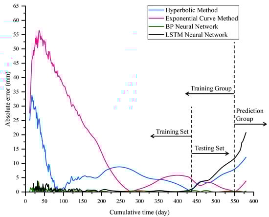 Figure 4 further compares the absolute errors of the four models. The results reveal that both the hyperbolic and exponential curve models exhibit substantial errors during the training group, with fluctuations showing a repeated pattern of increase and decrease. The maximum error of the hyperbolic model reaches 33.3 mm, while that of the exponential model reaches 40.17 mm. During the prediction phase, the errors of both models gradually increase, eventually exceeding 4.7 mm, with maximum values of up to 12.1 mm. Although the LSTM model maintains relatively small errors in the training group, its errors accumulate considerably in the testing and prediction phases, again confirming its overfitting problem. By contrast, the BP neural network shows only slight fluctuations in error during training, with consistently high predictive accuracy. Although the errors in the prediction phase also show a gradual increasing trend, the magnitudes remain very small, making the BP model markedly superior to the other approaches.
