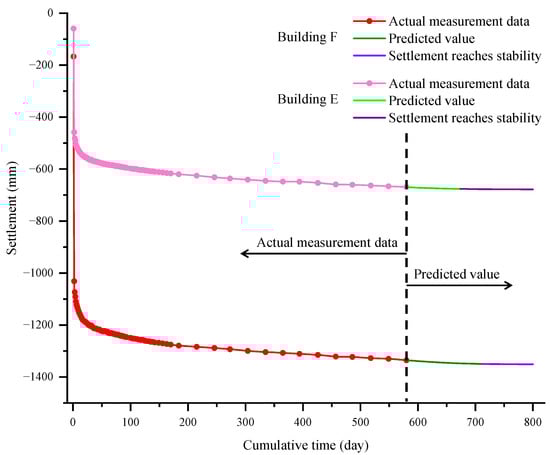 Building F, which experienced the most significant impact from the hazard within the study area, was selected for detailed analysis. According to relevant engineering standards [], a building is considered to have reached a stable settlement state when the maximum daily settlement rate over the last 100 days falls below 0.01–0.04 mm/day. Based on this criterion, both the total settlement and the time to stabilization of Building F were predicted.