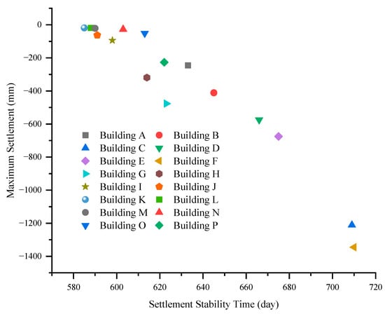 The trained BP neural network model was applied to predict the settlement of Buildings E and F to determine their stabilization times. The predicted settlement curves are presented in Figure 5. As shown, both buildings exhibit a trend of increasing settlement with a gradually decreasing rate. Specifically, the daily settlement rate of Building E falls below 0.04 mm/day at approximately 675 days, while Building F reaches this threshold around 710 days. Following these points, the settlement rates continue to decline, indicating that both buildings meet the defined stabilization criteria. Subsequently, stability predictions were conducted for all other buildings, and the stability time and maximum settlement are shown in Figure 6.