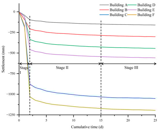 To investigate the temporal evolution of building settlement, six representative buildings (A–F) that exhibited significant deformation were selected. While other structures in the area also display similar settlement characteristics, these six buildings present the patterns more distinctly in the monitoring data, as illustrated in Figure 7. The strata affected in this area are mainly composed of sand and clay, whose geotechnical characteristics differ substantially: sand is highly erodible and consolidates rapidly, whereas clay is more resistant yet consolidates extremely slowly. Based on monitoring data, together with the underlying causes of the disaster and the contrasting properties of sand and clay, the settlement process of the buildings can be divided into three stages: