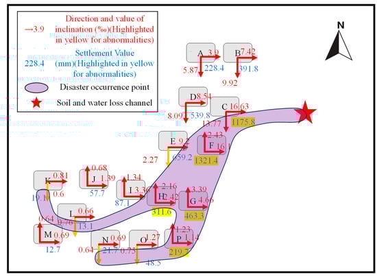 Firstly, the deformation characteristics of six buildings (A through F) located within 300 m of the hazard epicenter were analyzed. Buildings B, C, and F, situated closer to the hazard site, experienced larger settlements compared to Buildings A, D, and E. Interestingly, although the distances from the hazard point to Buildings B, C, and F do not differ significantly, an anomalously large settlement exceeding 1 m was observed at Buildings C and F on the southeastern side of the area. This is notably higher than the 391.8 mm settlement recorded at Building B. Furthermore, comparison among Buildings A, B, D, and E revealed that the southern portion of the region experienced substantially greater settlement than the northern part. Regarding tilt directions, five out of the six buildings showed inclination toward the hazard point. The maximum tilt was recorded at Building C, with an eastward tilt of 16.63‰. In contrast, Building E exhibited a southward tilt of 2.27‰ away from the hazard site. Comparing the tilts of Buildings C and F, Building C displayed a southward tilt of 13.77‰, whereas Building F showed a much smaller northward tilt of only 2.43‰.